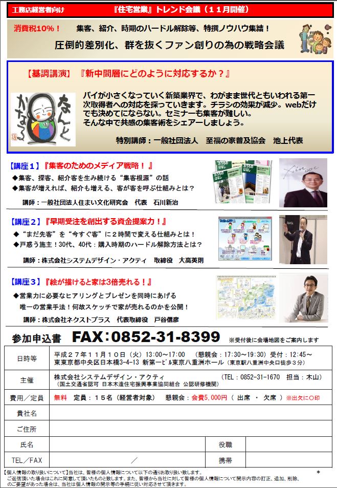 11月10日 工務店経営者向け『住宅営業』東京トレンド会議 『絵が描けると家は3倍売れる!』講座にて講師を務めます。